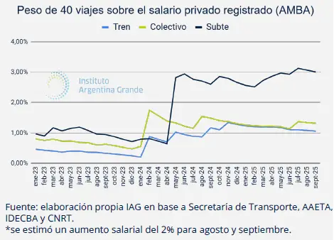 En relación, la política de precios del Gobierno de Javier Milei modificó la estructura de precios relativos y dio lugar a un panorama donde los gastos fijos tienen cada vez mayor peso en las economías familiares. De acuerdo con un informe del Instituto Argentina Grande (IAG), el pasaje de subte escaló, en términos reales, un 300%, el de tren 284% y el de colectivo 150%, más que duplicando su peso en el salario. Como resultado, la cantidad de viajes en los últimos dos años ae contrajo entre 12 y 18%.