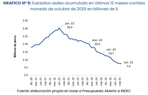 Respecto de los subsidios económicos a los servicios, indicaron que en octubre “presentan una reducción real del 46% acumulado en doce meses corridos respecto a igual periodo anterior”. Bajo esta medición, los subsidios son 64% menores a los observados en enero de 2024 y 75% inferiores respecto del pico de doce meses acumulados de junio de 2022.